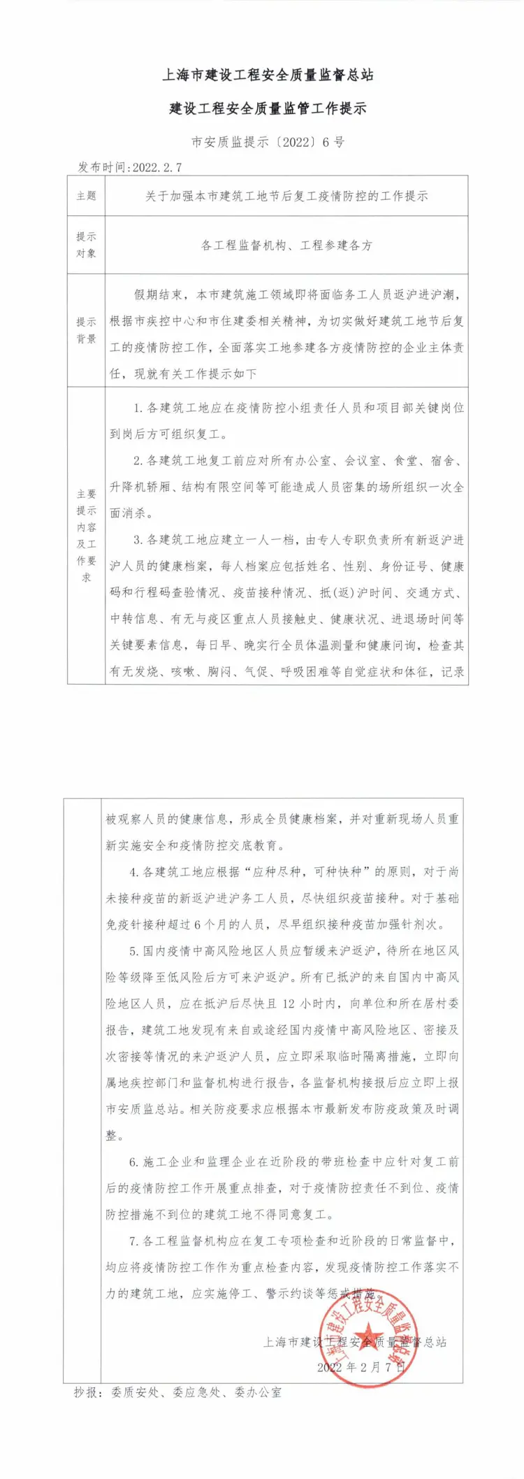 市安质监提示【2022】6号《关于加强本市建筑工地节后复工疫情防控的工作提示》