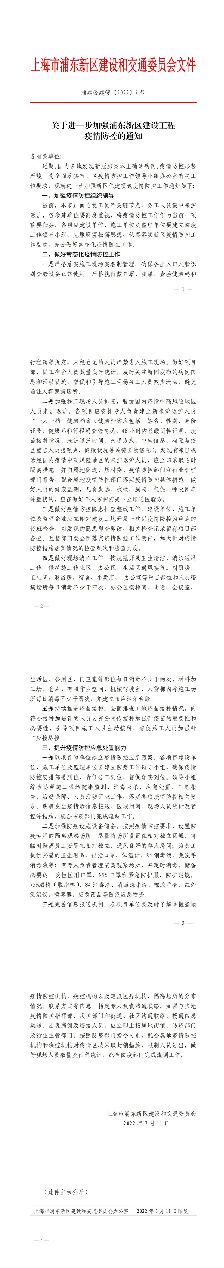 浦建委建管【2022】7 号《关于进一步加强浦东新区建设工程 疫情防控的通知》