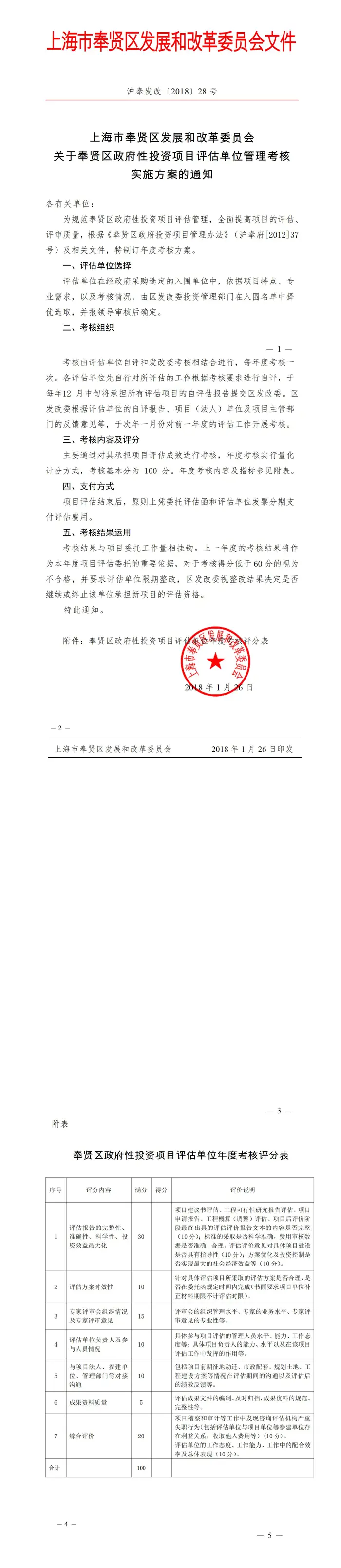 [奉贤]关于奉贤区政府性投资项目评估单位管理考核实施方案的通知【沪奉发改[2018]28号】